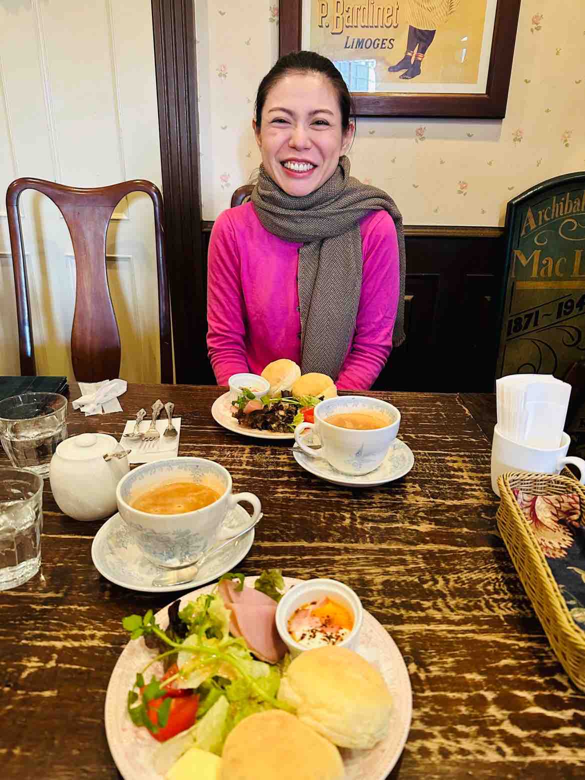 ☆英国風のカフェでイングリッシュマフィンのモーニングとロイヤルミルクティーをいただきながら楽しくおしゃべり。このボリュームでも有名な〈イングリッシュ ブレックファスト〉よりはボリューム少なめだそう。スローガン大切。